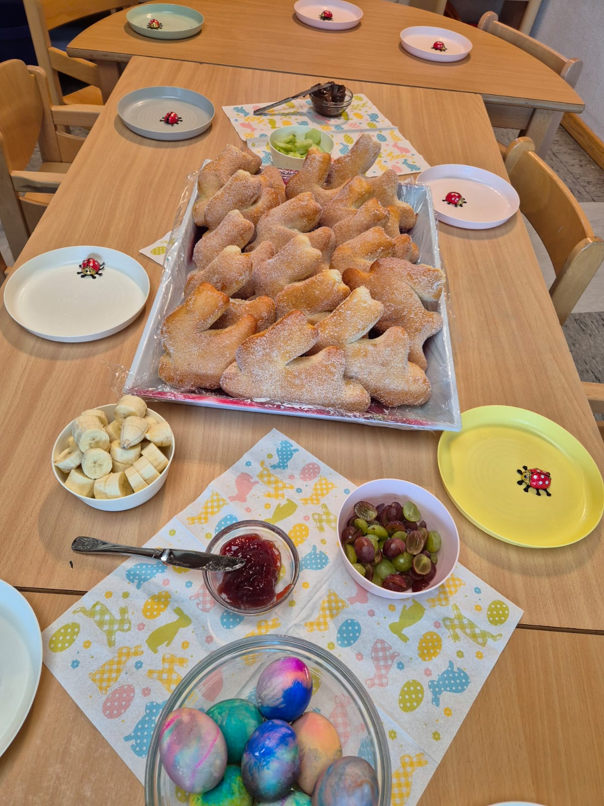 Die Kita hat gemeinsam mit den Eltern ein wunderschönes Osterfrühstück organisiert – mit frischem Obst, Marmelade und bunten Osterservietten, die für die perfekte Frühlingsstimmung sorgten. Liebevoll gefärbte Eier durften natürlich auch nicht fehlen!